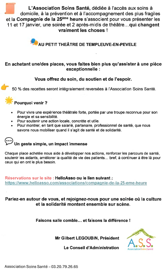 En 2025, l’association Soins Santé de Templeuve inaugurait son nouveau siège, un an après avoir fêté ses 50 ans ! Bien que l’association soit située à Templeuve, elle fonctionne de manière autonome par rapport au budget municipal de la ville. Aussi, si vous voulez passer un bon moment tout en faisant une bonne action, venez Lire la suite